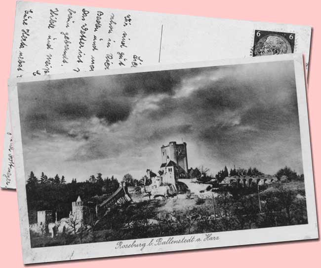 Ansicht der Roseburg von Ballenstedt kommend. Heute verwehrt umfangreicher Pflanzenbewuchs diese Betrachtungweise. Im August 1938 übermittelte diese Karte Grüße aus Rieder an die Eltern in Halle/Saale. Die Briefmarke kostete seinerzeit 6 Pfennige. |